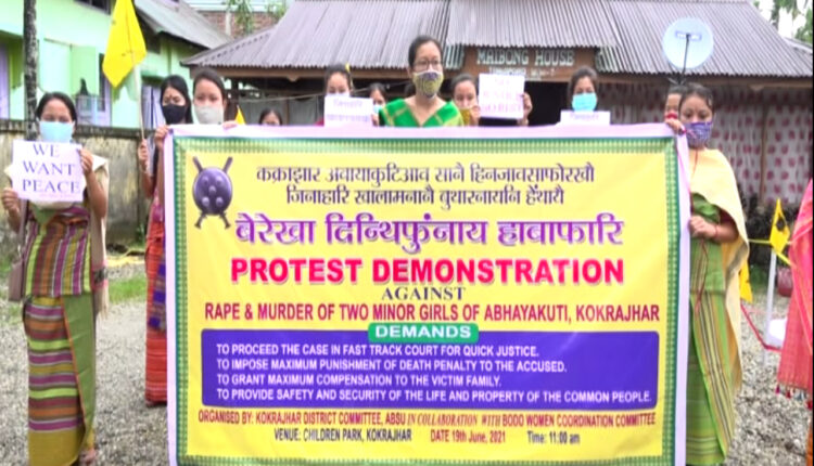 Guwahati, June 19 (NKTV): The ABSU and Bodo women coordination committee staged a protest demonstration in Kokrajhar today in support of demanding capital punishment for involved culprits, providing compensation to the family members of Abhayakhuti incident.