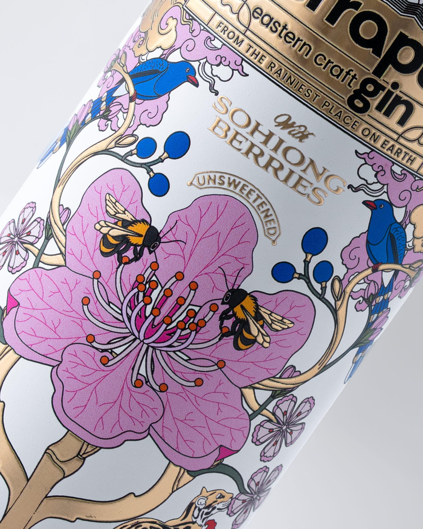 These components deliver a lush, floral, citrus-forward profile informed directly by highland ecology. The deep berry tone and its gentle sweetness come solely from Sohiong berries and the textural body of taro. When served over ice or lengthened with tonic or soda, the concentrated colour softens into a clean, pale pink derived entirely from natural berry and blossom pigments. Aromatics rise in sequence: juniper, berry brightness, and restrained florals.
