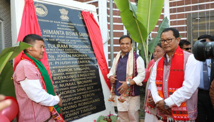 Adding a new chapter to the ongoing growth story in Karbi Anglong, Chief Minister Dr. Himanta Biswa Sarma on Monday inaugurated multiple projects costing a total of Rs. 168 crores. The projects inaugurated today are the 3,000-seating capacity Sertalin Auditorium at Taralangso built at a cost of Rs. 35 crores, the Sarsing Teron Langkung Habe Multi-purpose Sports Complex at KASA Satdium in Diphu built at a cost of Rs. 75 crores, the extended arm of the Kajir Ronghangpi VIP Guest House at Taralangso built at a cost of Rs. 5.57 cores, the beautification of the Langkung Phang Fishery at Taralangso costing approximately Rs. 2.55 crores, the RangsinaSarpoAhongjai Permanent Open Space at Taralangso built at a project cost of Rs. 5.50 lakhs, the beautification of Kuleng Abi Fishery at Taralangso that cost an amount of Rs. 2 crores, the Rongbong Artu, Karbi Capital Complex at Taralangso costing around Rs. 6.86 crores, the landscaping and beautification of Karbi People’s Hall at Taralangso at a project cost of Rs. 3.78 crores, the Cheleng Athepai in the memory of Jirlong Ariso at Taralangso costing around Rs. 4.2 crores, the Sing Mirjeng VIP Gallery at Taralangso costing Rs. 99 lakhs, the new market complex at Rongkhelan in Diphu costing around Rs. 10 crores, the Song Bey Inter-state Bus terminus at DM Road in Diphu that cost Rs. 12 crores and the truck terminus at Diphu costing Rs. 5 crores.