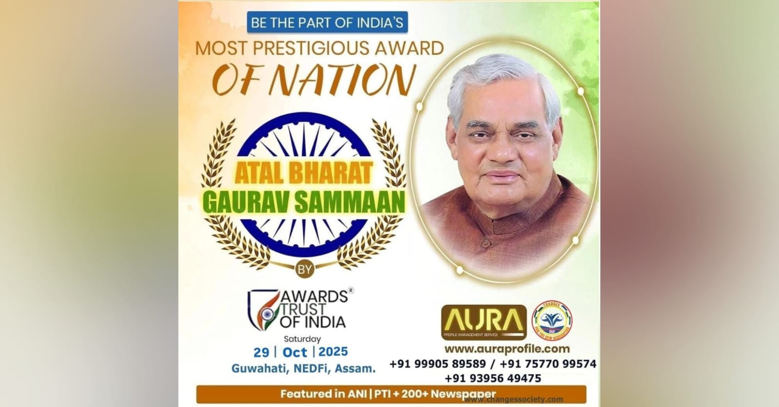 Aura Profile Management & Changes Society is all set to organize the prestigious Atal Bharat Gaurav Sammaan 2025 on Wednesday, October 29, 2025, at NEDFi House, Dispur, Guwahati. The grand event will celebrate excellence, honor distinguished individuals, and pay tribute to notable contributors to society and the nation.