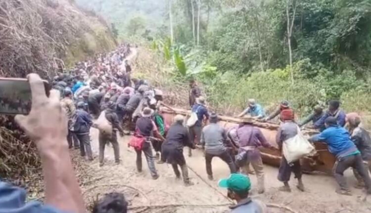 The log drum, gifted by Shingnyu Village under Mon district to the people of Noklak, was brought to the outskirts of Noklak town last afternoon after almost four days of pulling across difficult terrain, a feat involving around 300 volunteers including villagers from neighbouring Myanmar.