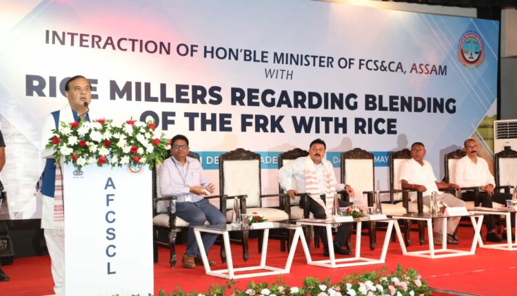 Assam Chief Minister Dr. Himanta Biswa Sarma on Wednesday joined an interactive meeting of the rice millers of the State with the Department of Food, Civil Supplies & Consumer Affairs held at the Maniram Dewan Trade Centre in Guwahati. Organized primarily to address the subject of meeting the July 1, 2023 target of fortified rice kernels (FRK)-blended milled rice by rice millers, the meeting also touched upon other issues that have the potential to benefit millers as well as paddy cultivators of the State. As per directives from the Government of India, rice to be procured by the government agencies from coming July 1 have to be mandatorily blended with fortified rice kernels. The Government of Assam has extended subsidies of upto ₹2 lakh per mill for purchase of blender machines, required for the purpose of blending of general rice grains with FRK.