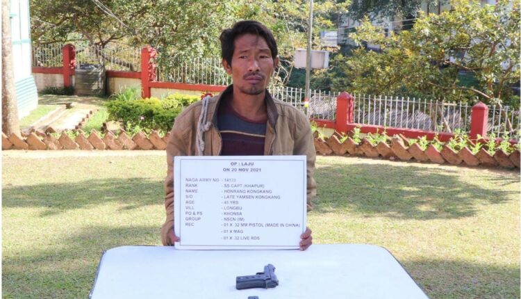 The apprehended hardcore insurgent has been identified as Self Styled Captain (Khapur) Honrang Kongkang of NSCN (IM) who is a close associate of Self Styled Colonel Apem Tangkhul, the operational commander of NSCN (IM) of Tirap District, Self Styled Captain Sina Mophuk of NSCN (IM) and Self Styled Major Victor Tangkhul of NSCN (IM). The apprehend was involved in carrying out extortion activities and planning sabotage activities against the security forces. The apprehended insurgent also revealed the involvement of NSCN (IM) in planning an ambush and IED attack against security forces in Sanliam village on 21 Oct 2020.
