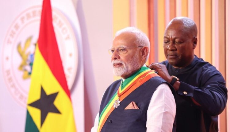 Prime Minister Narendra Modi on Wednesday was conferred with Ghana’s national honour,  ‘The Officer of the Order of the Star of Ghana’, by President John Dramani Mahama, in recognition of his distinguished statesmanship and influential global leadership, the Ministry of External Affairs said in a statement.