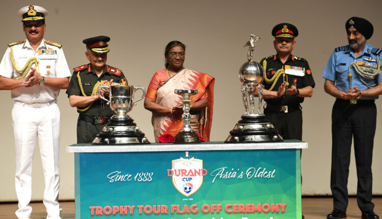 The President of India, Droupadi Murmu unveiled the Trophies of the Durand Cup Tournament 2024 at a function held at Rashtrapati Bhavan Cultural Centre today (July 10, 2024). The Trophies unveiled include the Durand Cup, the President’s Cup and Shimla Trophy.