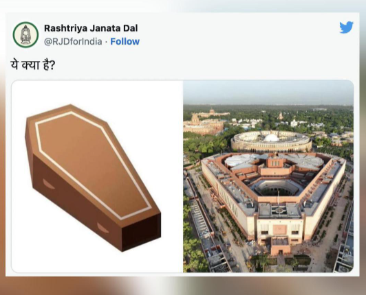 In an apparent comparison with the new Parliament, RJD has shared an image of a coffin next to the new seat of power. The party has captioned the image as ‘Ye Kya Hai’.